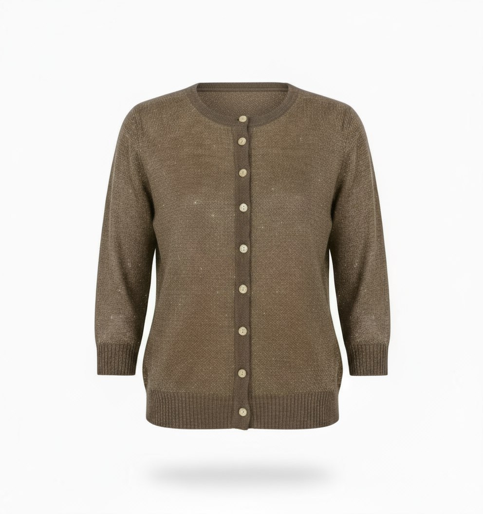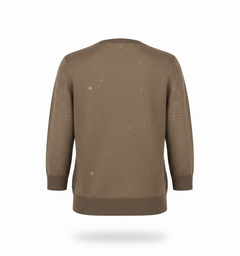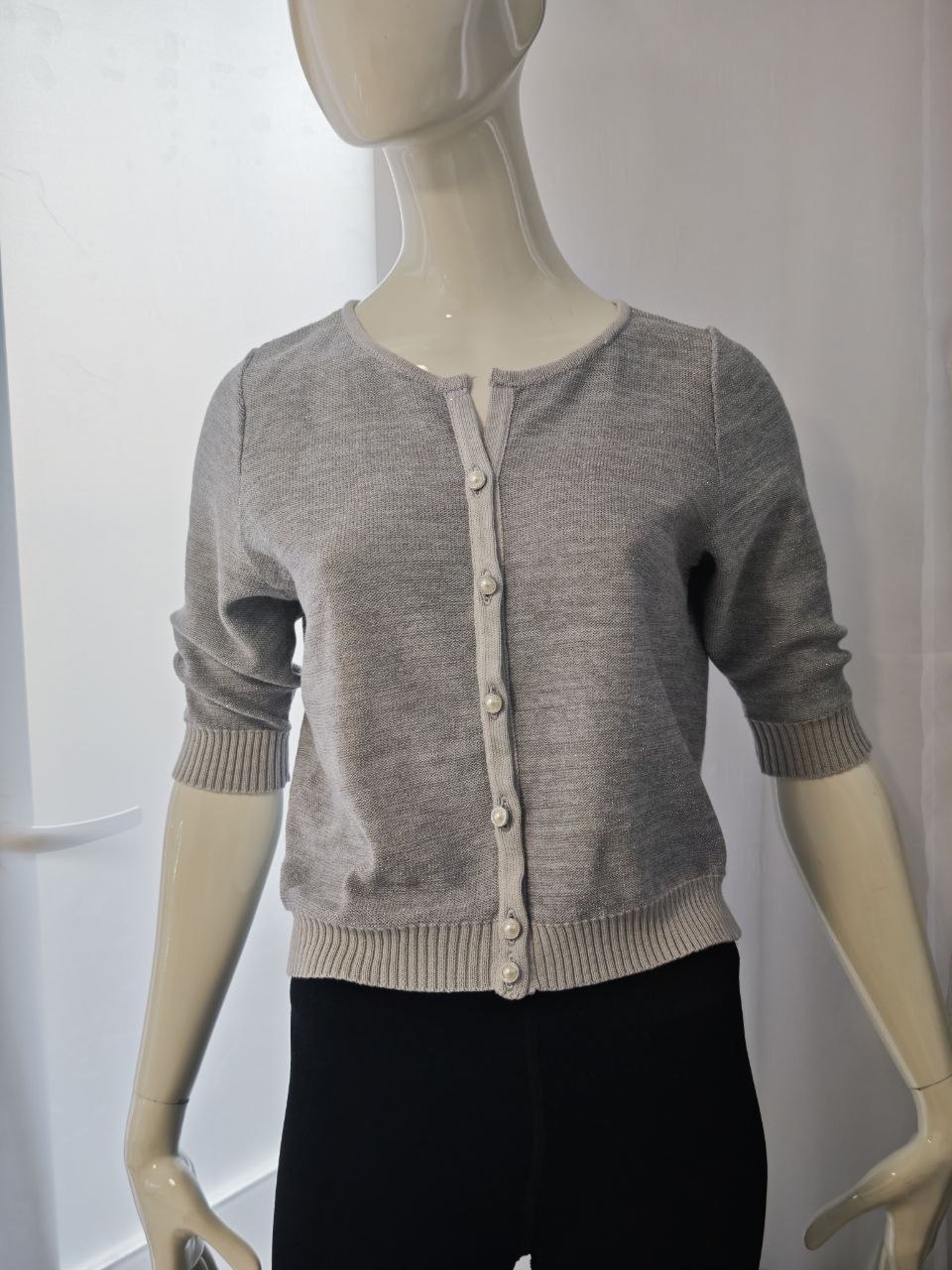 Нежная тонкая кофточка из хлопка с люрексом. Чтобы люрекс не колол кожу и было комфортно носить, внутренняя часть выполнена из хлопка. Лицевая сторона вывязана таким образом, чтобы люрекс переливался только на складках полотна. Этим достигается особый «мерцающий» эффект. Жемчужные пуговицы и укороченный рукав подчеркивают романтический образ. Размер S.