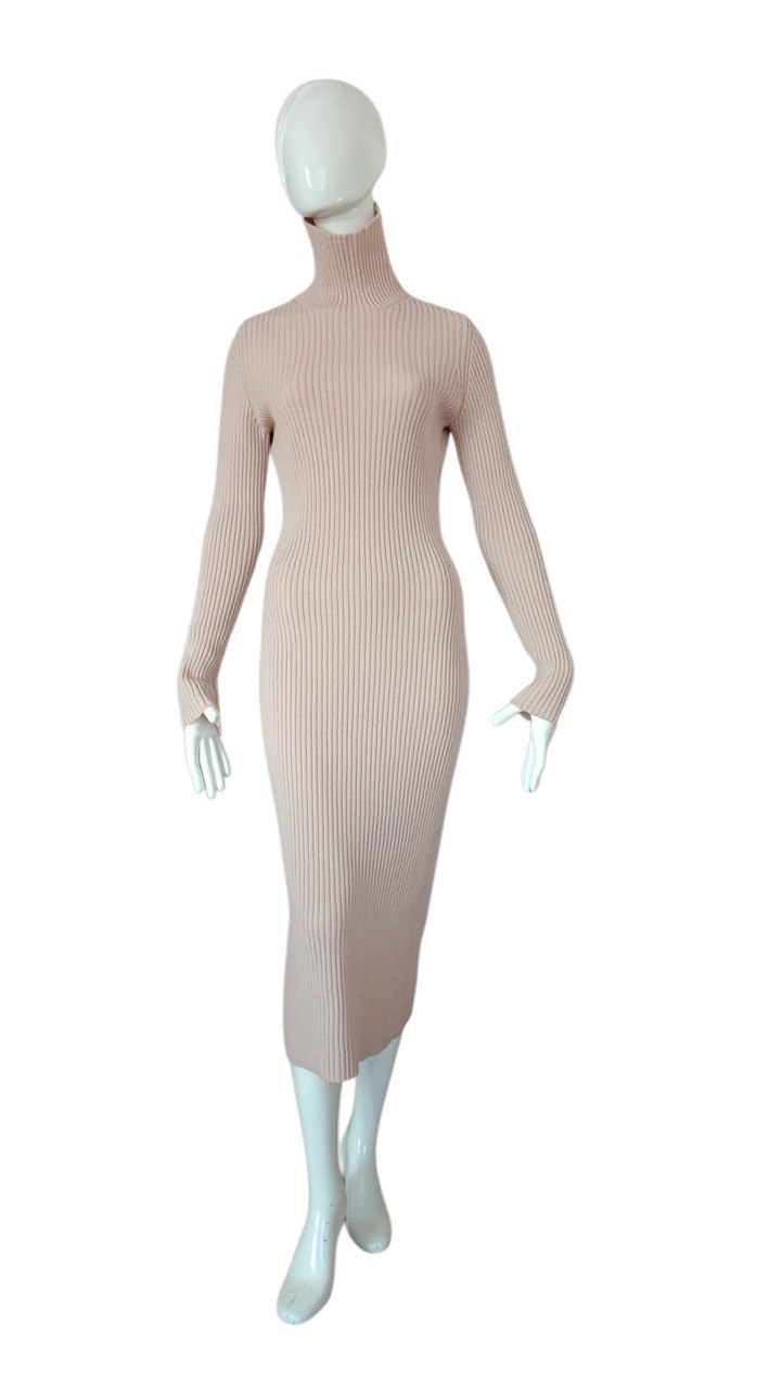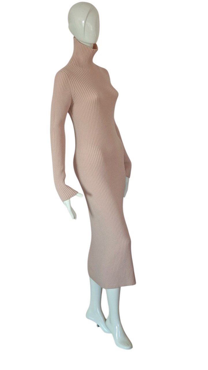 Платье связано из мериноса с добавлением эластана. Прекрасно держит форму. Высокий воротник стойка. Размер 46-48. Длина изделия 120см., длина рукава 60 см.